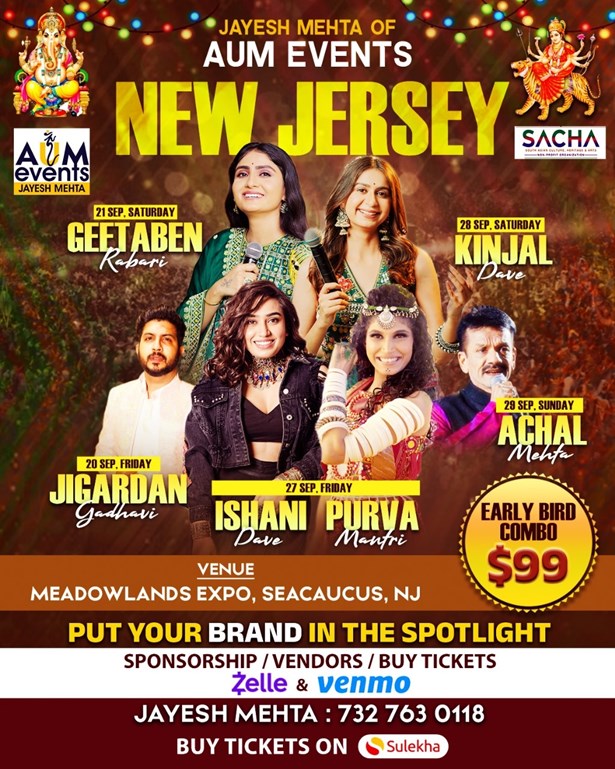 This NAVRATRI, Aum Events presents the Biggest Festival of Garba-Raas & Dandiya in NEW JERSEY with 5 nights of Celebrations with 6 Latest & the Best Garba Artistes with band from India.