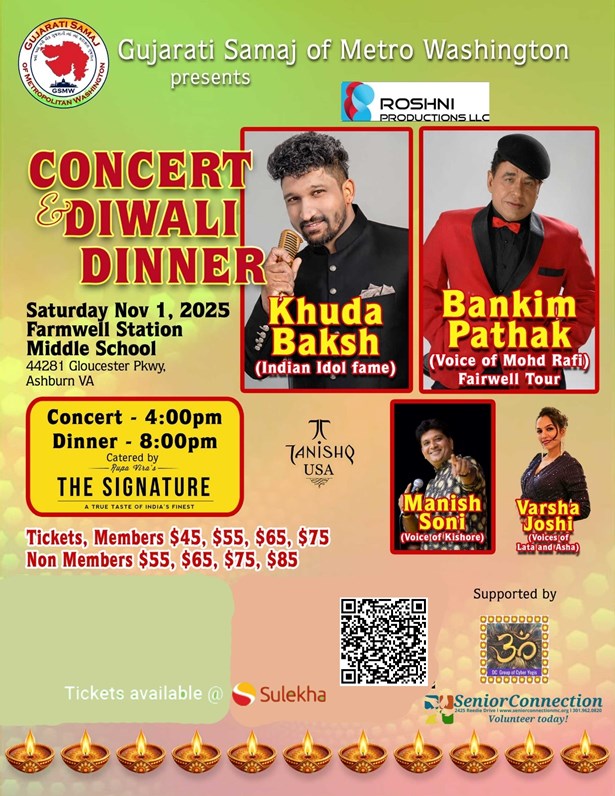 Buy ticketsEvent InfoVenueArtists Info Videos GalleryT & C FAQ Covid-19 Info Buzz Ticket Information Pay $0.00Register General Tickets - Non Reserved( FOR MEMBERS ) $45.00 Available 0 1 2 3 4 5 6 7 8 9 100 Ticket close on Nov 1 General - Non Reserved ( Non Members) $55.00 Available 0 1 2 3 4 5 6 7 8 9 100 Ticket close on Nov 1 $55 ( FOR MEMBERS ) $55.00 Available 0 1 2 3 4 5 6 7 8 9 100 Ticket close on Nov 1 $55 (Non - MEMBERS ) $65.00 Available 0 1 2 3 4 5 6 7 8 9 100 Ticket close on Nov 1 $65 ( MEMBERS ) $65.00 Available 0 1 2 3 4 5 6 7 8 9 100 Ticket close on Nov 1 $65 (NON - MEMBERS ) $75.00 Available 0 1 2 3 4 5 6 7 8 9 100 Ticket close on Nov 1 VIP ( MEMBER ) $75.00 Available 0 1 2 3 4 5 6 7 8 9 100 Ticket close on Nov 1 VIP ( NON MEMBER ) $85.00 Available 0 1 2 3 4 5 6 7 8 9 100 Ticket close on Nov 10 Tickets / Total: Pay $0.000 Tickets Register Order Summary Tickets Order Summary Amount Payable $ Event Details Venue Details Farmwell Station Middle School44281 Gloucester Pkwy , Ashburn , VA 20147 X Report Error Is the information provided incorrect? Report it now! Event has been cancelled Event has been postponed This is an Adult event Event is fake/Inappropriate/Duplicate This event is a spam Please remove this event This event is private About this eventExperience a Spectacular Diwali Concert Dinner in Virginia Immerse yourself in a cultural extravaganza this Diwali with the much-anticipated concert dinner featuring Khuda Baksh and Bankish Pathak on the 1st of November, 2025. Hosted by the esteemed Gujarati Samaj Of Metropolitan Washington 2024, this event will be a confluence of Hindi and Gujarati music, filled with enchanting live performances that are sure to make your Diwali memorable. This festive fusion of music, singing, and Bollywood will be held at Farmwell Station Middle School in Ashburn, Virginia, known for its secure and accessible location. Meet the Maestro – Khuda Baksh Khuda Baksh, our premier artist for the evening, is a renowned Indian singer and playback singer who has captured the hearts of millions with his soulful voice. Born on 17th March 1995 in Badal Village, Muktsar, Punjab, India, Khuda Baksh has carved a niche for himself in the music industry with his versatile singing style. His melodic renditions, combining elements of classical and contemporary, promise an unforgettable musical experience. Discover Farmwell Station Middle School – Your Venue Our event will take place at the Farmwell Station Middle School, located at 44281 Gloucester Pkwy, Ashburn, VA, United States. Known for its accessibility and safety, this venue is ideal for a family-friendly event such as ours. With ample parking and a variety of Indian restaurants in the vicinity, you can enjoy a hassle-free experience before and after the event. So, come and join us in celebrating Diwali in the heart of Virginia! Your Ticket to a Memorable Diwali Celebration We have a variety of ticket options available for our guests. For our members, we have General Non-Reserved tickets priced at $45.00, as well as $55.00 and $65.00 options. Non-members can avail the General Non-Reserved tickets for $55.00, or opt for the $65.00 and $75.00 tickets. We also offer VIP tickets for both members and non-members, priced at $75.00 and $85.00 respectively. Book your tickets today and join us for an unforgettable Diwali celebration! Terms & Conditions1. Tickets once purchased cannot be modified or cancelled. Refunds will be initiated only in case of event cancellation. 2. Transaction fee per ticket may be levied. Please check the total amount before payment. 3. Organizers hold the right to deny late entry to the event. Hence, we recommend reaching the venue an hour before the event starts to ensure smooth entry. 4. If an event is canceled/postponed, Sulekha will refund only the face value of the ticket and NOT the transaction fee. 5. Every venue has its own rules and regulations. They hold the right to deny entry on the basis of the same. 6. These terms and conditions are subject to change from time to time at the discretion of the organiser. 7. Important Alert: Tickets purchased from third parties are not authorized by Sulekha and will be denied entry. Buy only from Sulekha to ensure valid access. 8. As per current Washington Metro Area mandatory health requirements, all attendees must present proof of a COVID-19 vaccination in order to enter the venue and attend the show. 9. Mask wearing is mandatory for all. 10. The venue reserves the right to alter safety protocols at any time and at its sole discretion of the management. 11. The event organizers value the safety of our audiences, artists, and staff. FAQ's Where is the Khuda Baksh Concert happening? Farmwell Station Middle School, 44281 Gloucester Pkwy, Ashburn, VA When do Khuda Baksh event tickets go on sale in Ashburn, VA? Khuda Baksh upcoming concert tour tickets go on sale 1 to 2 months prior to the performance and sometimes even a year in advance. Once the tour dates and concert schedule are announced, you can check our event calendar to find the date and venue. Khuda Baksh concert tickets will generally be available within 24-48 hours of a tour announcement. How do I purchase tickets? There are several options when buying tickets: You can purchase any ticket to any events listed on our website. To buy, select the # of tickets you want to purchase in the dropdown of a specific event and follow the instructions. Email. Not sure where to go or how to buy tickets? Email us at us.sulekha@sulekha.com. Phone. You can purchase tickets over the phone 1-512-788-5300 (Mon to Fri - 11am to 8pm – EST) What is Sulekha's Refund Policy? All sales are final. No Refunds will be issued under any circumstance unless an event is canceled or rescheduled. If you event is canceled, in most cases you won't need to do anything. We will inform you about the cancelation and face value of the ticket will be refunded to your account, NOT the transaction fee. Refund will be proc