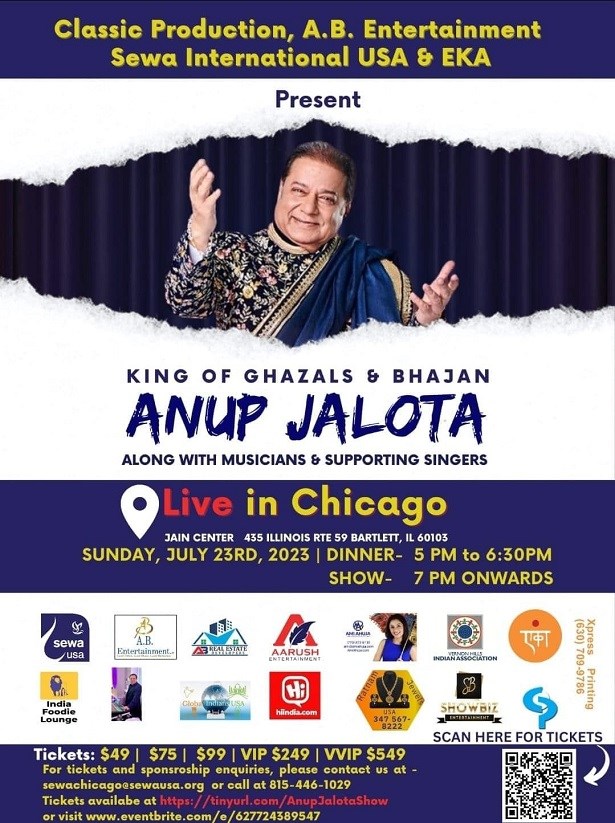 THE MAESTRO OF SOULFUL AND MESMERIZING SINGING, PADMA SHRI ANUP JALOTA HONORED BHAJAN & GAZAL SAMRAT, Performing Live in Chicago at Jain Center Bartlett at 7pm, July 23rd, 2023 Sunday Jain Center Bartlett, Chicago.