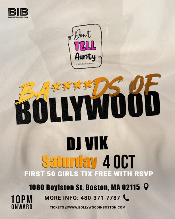 Buy ticketsEvent InfoVenueArtists Info Videos GalleryT & C FAQ Covid-19 Info Buzz Ticket Information Pay $0.00Register GIRLS ADMISSIONGirls Admission ONLYGirls Admission ONLY hide $20.00 Available 0 1 2 3 4 5 6 7 8 9 100 Ticket close on Oct 4 BOYS ADMISSION $30.00 Available 0 1 2 3 4 5 6 7 8 9 100 Ticket close on Oct 40 Tickets / Total: Pay $0.000 Tickets Register Order Summary Tickets Order Summary Amount Payable $ Event Details BOLLYWOOD SATURDAYS – EVERY SATURDAY AT DON'T TELL AUNTY BOSTON! NON-STOP MUSIC, HIGH ENERGY, AND UNFORGETTABLE VIBES!Music : DJ VIKDate:SATURDAY , OCTOBER 4TH, 2025Venue:DON'T TELL AUNTY1080 Boylston St, Boston, MAMORE INFO - RAKESH :480-371-7787Doors Open10:00pmStrictly A 21+ Event ONLYIMPORTANT NOTES - PLEASE READ* Be There Early To Avoid Long Lines* All Tickets are Final an NO REFUNDS whatsoever* CLUB has the right to refuse if capacity is reached. So COME EARLY !VALID FORM OF ID :State issued ID / Driver License or Passport. NO other forms of identification will be accepted! Photocopies or pictures of your IDs on your phone will NOT be accepted.Space is limited, FIRST COME FIRST SERVE. (NO REFUNDS) so buy your tickets soonNOTE:This is a public event which will be recorded. You may appear in pictures/video recordings. We have full rights to use this media anywhere without seeking your prior or post permissions.Venue Details Don't Tell Aunty1080 Boylston Street , Boston , MA 02115 X Report Error Is the information provided incorrect? Report it now! Event has been cancelled Event has been postponed This is an Adult event Event is fake/Inappropriate/Duplicate This event is a spam Please remove this event This event is private About this eventExperience the Sparkle of Bollywood at Don't Tell Aunty Mark your calendars for the 10th of April, 2025 for a night to remember! Get ready for the BA****DS OF BOLLYWOOD at DON'T TELL AUNTY, a Bollywood Saturday special brought to you by USA DESI EVENTS LLC. Dance the night away to the rhythm of Hindi, Punjabi, English, and Telugu music. Savor the taste of a multilingual Bollywood night party in Boston, featuring food & drink, live in concert. It's not just a party, it's a Bollywood-style celebration! Meet the Artist Behind the Beats Though the artist behind this magical night has chosen to remain in the shadows, the enchanting music and vibrant environment they create are anything but hidden. Their talent is well-known and appreciated by the Bollywood community, and their ability to blend Hindi, Telugu, English, and Punjabi beats into a seamless and exciting mix keeps audiences returning time and again. Get ready to experience a night filled with fun, dance, and music that will transport you straight to Bollywood. Discover the Charm of Don't Tell Aunty Hosted at the vibrant Don't Tell Aunty, located at 1080 Boylston Street, Boston, MA, United States, this event guarantees a memorable night. The venue prides itself on its safety and easy accessibility. Known for its lively ambiance and proximity to an array of Indian restaurants, Don't Tell Aunty is the perfect place to immerse yourself in the Bollywood vibe. Parking is also available, ensuring your night is hassle-free from start to finish. Your Entry Pass to Bollywood Extravaganza Join in the fun with our GIRLS ADMISSION at $20.00 or BOYS ADMISSION at $30.00. Each ticket is your pass to experience a thrilling night of Bollywood music, dance, food & drink, and live concert. Don't miss out on this unforgettable Bollywood Saturday night! Terms & Conditions1. Tickets once purchased cannot be modified or cancelled. Refunds will be initiated only in case of event cancellation. 2. Transaction fee per ticket may be levied. Please check the total amount before payment. 3. Organizers hold the right to deny late entry to the event. Hence, we recommend reaching the venue an hour before the event starts to ensure smooth entry. 4. If an event is canceled/postponed, Sulekha will refund only the face value of the ticket and NOT the transaction fee. 5. Every venue has its own rules and regulations. They hold the right to deny entry on the basis of the same. 6. These terms and conditions are subject to change from time to time at the discretion of the organiser. 7. Important Alert: Tickets purchased from third parties are not authorized by Sulekha and will be denied entry. Buy only from Sulekha to ensure valid access. 8. As per current Boston Metro Area mandatory health requirements, all attendees must present proof of a COVID-19 vaccination in order to enter the venue and attend the show. 9. Mask wearing is mandatory for all. 10. The venue reserves the right to alter safety protocols at any time and at its sole discretion of the management. 11. The event organizers value the safety of our audiences, artists, and staff. FAQ's How do I purchase tickets? There are several options when buying tickets: You can purchase any ticket to any events listed on our website. To buy, select the # of tickets you want to purchase in the dropdown of a specific event and follow the instructions. Email. Not sure where to go or how to buy tickets? Email us at us.sulekha@sulekha.com. Phone. You can purchase tickets over the phone 1-512-788-5300 (Mon to Fri - 11am to 8pm – EST) What is Sulekha's Refund Policy? All sales are final. No Refunds will be issued under any circumstance unless an event is canceled or rescheduled. If you event is canceled, in most cases you won't need to do anything. We will inform you about the cancelation and face value of the ticket will be refunded to your account, NOT the transaction fee. Refund will be processed by the same payment method used for purchase. By purchasing tickets you are accepting these terms. If you have any questions, please email us at us.sulekha@sulekha.com or call 1-512-788-5300 (Mon to Fri - 11am to 8pm – EST) Covid-19 Info Protecting Yourself Please follow the preventative measures recommended by the WHO and local authorities and public health agencies 