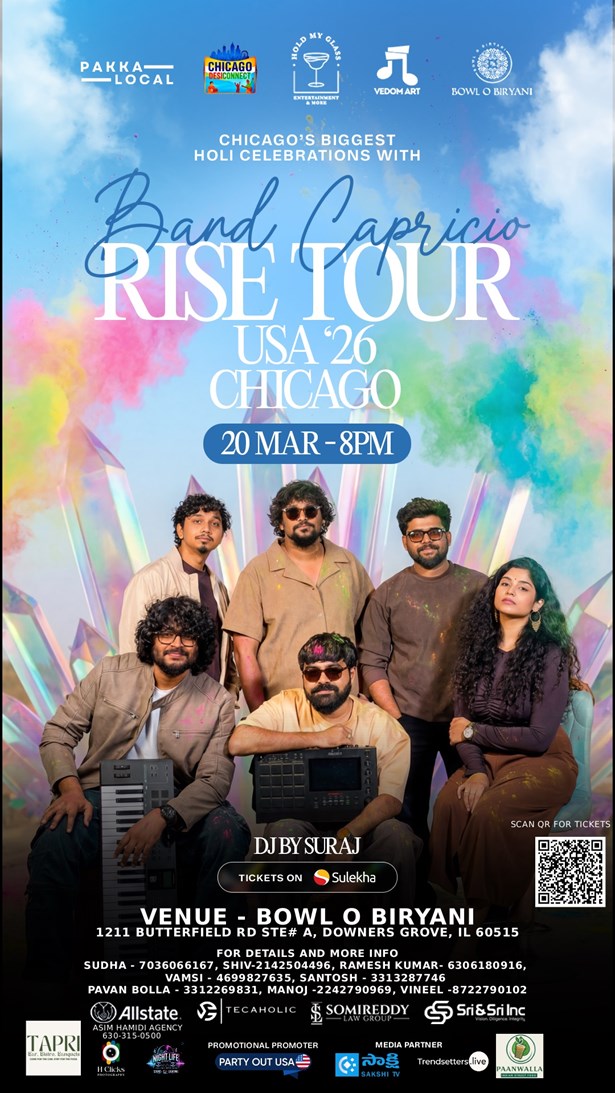 Mark your calendars for March 20th, 2026 and get ready for an unforgettable night of music, melody, and rhythm! Join us for the Band Capricio Rise Tour 2026 – Chicago, proudly presented by Chicago Desi Connect and Pakka Local Events. Expect a magical evening of Tollywood & Bollywood hits, live concert energy, singing, and non-stop dancing. This event is for all ages.