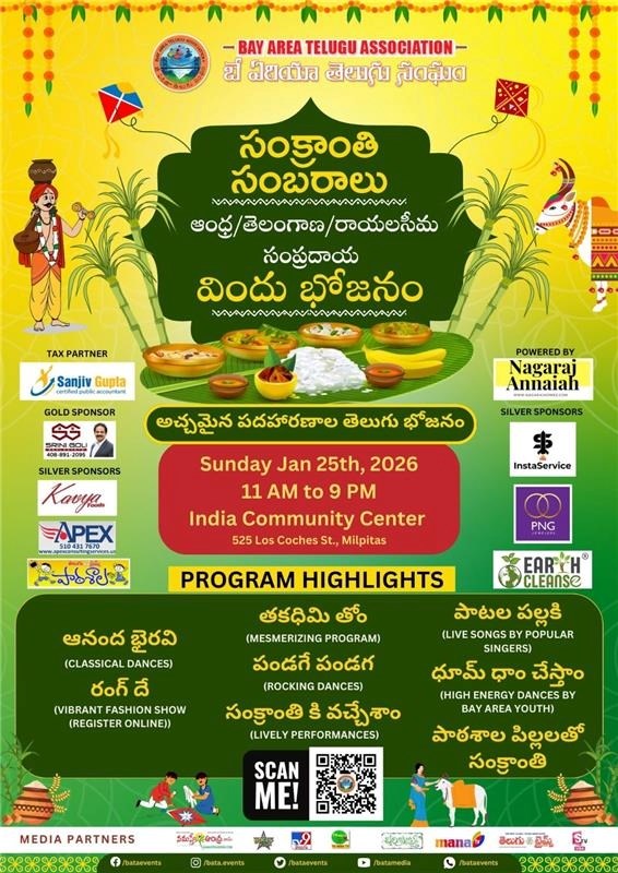 Join us in celebrating the vibrant cultural extravaganza - BATA Sankranti Sambaralu on January 25th, 2026. Hosted by the Bay Area Telugu Association, the event promises to be a grand affair filled with Dance, Food & Drink, Exhibition, Drama, and Live Concert. It's an opportunity to experience the rich Telugu culture, enjoy scrumptious food, and witness amazing live performances. Don't miss out on this one-of-a-kind cultural event.