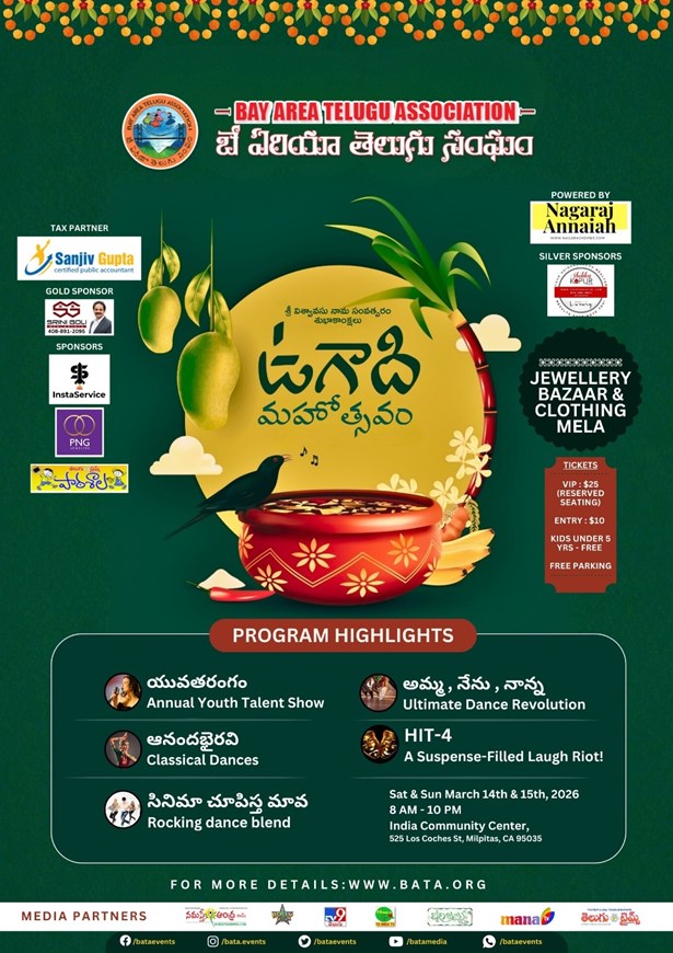 Mark your calendars for the 22nd of March, 2026 as the Bay Area Telugu Association welcomes you to the spectacular BATA Ugadi Mahotsavam 2026. Start your Telugu New Year with a splash of culture, religion, food, and music. This event promises an unforgettable experience of live concert, traditional Telugu cuisine, and spirited celebrations. Don't miss out on this enchanting Telugu New Year event!