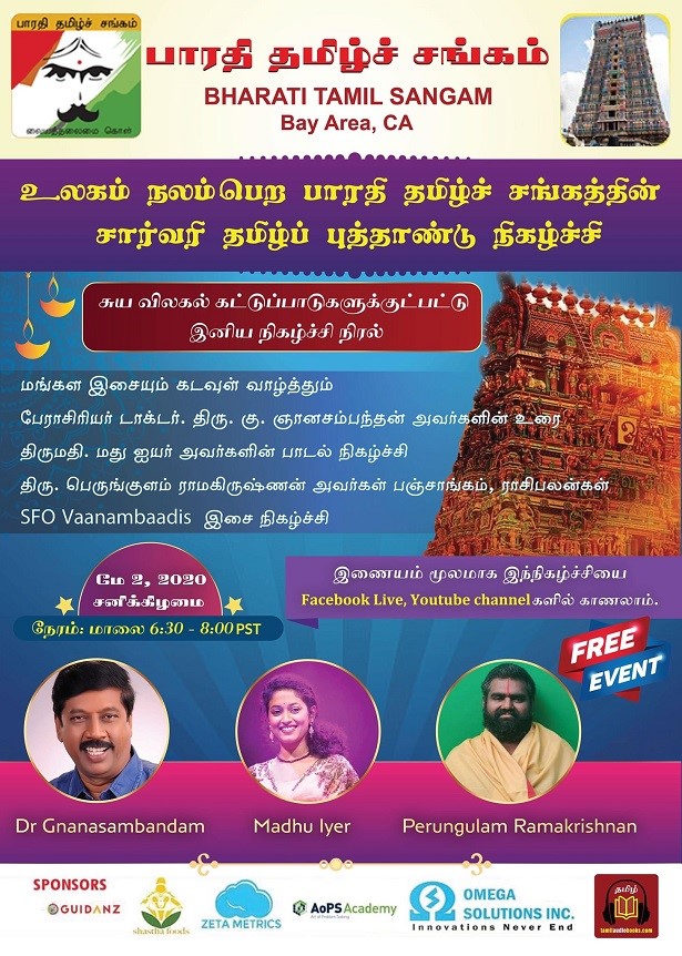 Event Details BATS program on Sarvari New Year on FB Live Save the date and time - Saturday, May 2 @ 6:30 PM Pacific standard time to listen to * Dr.K Gnanasambandan Avl 's motivating speech * SFO Vaanambadis rendition of the beautiful line up of song Time Zone