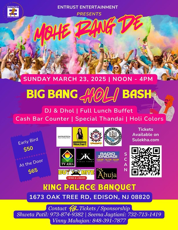 Join us on Sunday, March 23, 2025, from Noon – 4 PM at King Palace Banquet, Edison, NJ, for the ultimate HOLI CELEBRATION!