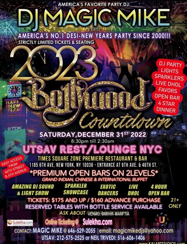 High End Bollywood New Years Eve in the Times Square Zone. USA's Legendary Desi DJ Magic Mike Spinning the Music Mix. Grand Dinner Buffet & Open Bar. Party Favors, Live Dhol Player , Exotic Dancer and More.. book Early Tickets very Limited