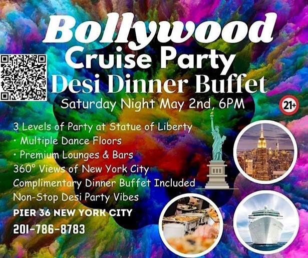 Get ready to groove to the rhythm of Hindi and multilingual music at the "Bollywood Cruise Party Desi Dinner Buffet" on the evening of Saturday, the 2nd of May, 2026. Set sail at Pier 36 NYC and immerse yourself in a night filled with pulsating beats, mesmerizing dance numbers, and an authentic desi dinner buffet. Your senses will be tantalized with the flavors of Indian cuisine and the sounds of Bollywood beats. It's a night of music, dance, food, and drink that you won't want to miss.