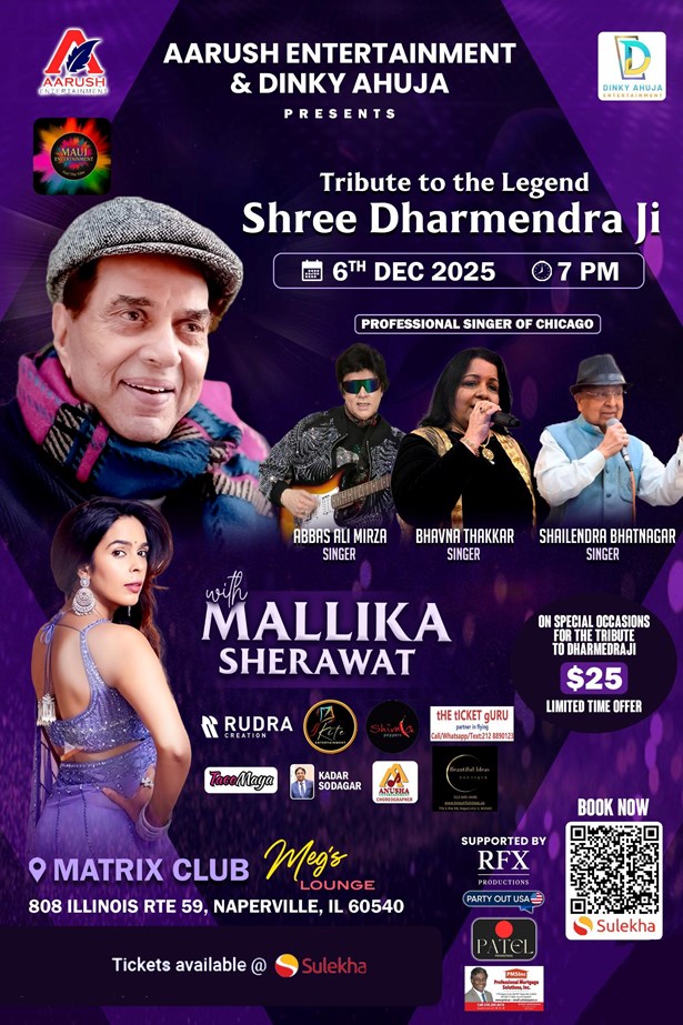 Experience his timeless charm, unforgettable songs, and magical memories brought to life by Chicago’s finest professional singers — Abbas Ali Mirza, Bhavna Thakkar & Shailendra Bhatnagar! 🎤✨