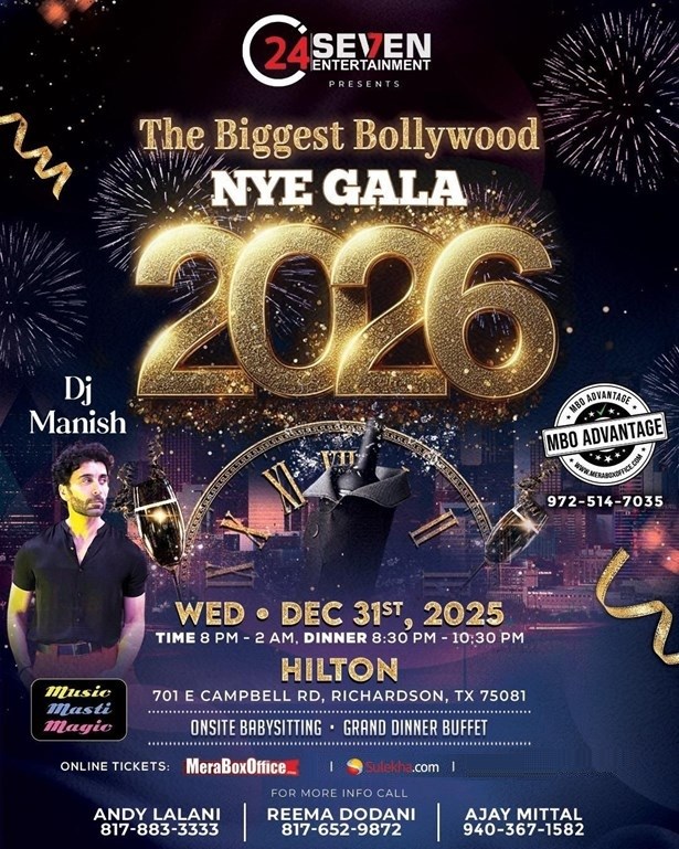Grand ballroom with a unique vibe !A lavish, onsite managed Grand Dinner Buffet—a feast to remember  Bollywood Beats: Dance the night away with the best tunes in Bollywood !A vibrant crowd, amazing performances, and a night you won't want to miss! Don't miss out on the BIGGEST New Year's Eve celebration in Dallas! Secure your tickets today and get ready to make memories that will last a lifetime! Buy Tickets Now!
