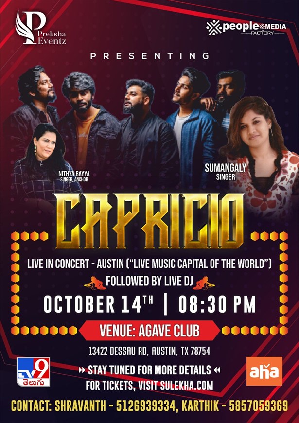 Come enjoy live music from Band Capricio, the most popular Telugu fusion band that blends different genres to bring a different aroma to music. Don't miss out on one of the biggest Classical Fusion Tollywood groups live in concert!
