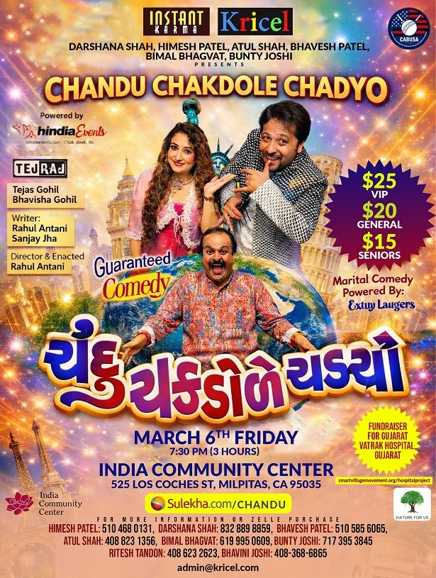 Get ready for an evening filled with laughter, entertainment, and nonstop comedy! Join us for the hilarious Gujarati stage show “Chandu Chakdole Chadyo” — a guaranteed comedy experience for the whole family.