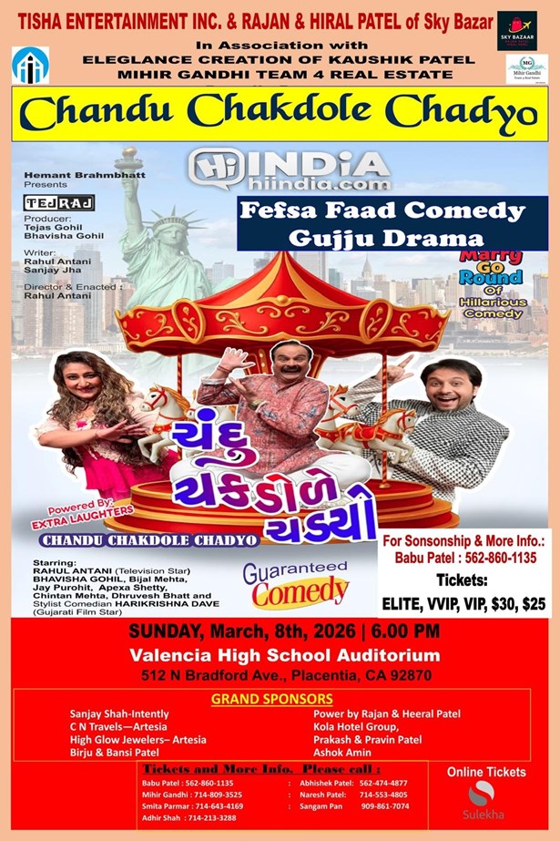 Prepare to laugh till your sides hurt as Tisha Entertainment proudly presents the hilarious Chandu Chakdole Chadyo in Los Angeles on the 8th of March, 2026. This comedy event, renowned for its witty humor and side-splitting gags, is a must for all comedy enthusiasts. So, mark your calendars and get ready for a night of unforgettable laughter!