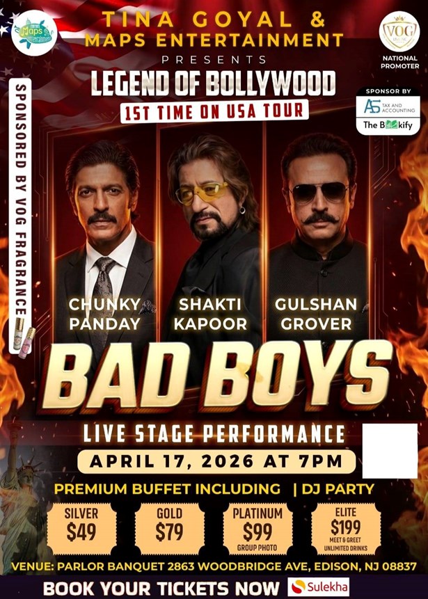 Unleash your Bollywood spirit at "Bollywood Bad Boys - Chunky Panday, Shakti Kapoor & Gulshan Grover Live in New Jersey" on the 17th of April, 2026. This electrifying evening promises a sensational fusion of Hindi music, soul-stirring singing, foot-tapping dance numbers, and a tantalizing food and drink experience. It's not just an event, it's a celebration of Bollywood's charm and charisma. So, mark your calendars and get ready to immerse yourself in an unforgettable Bollywood extravaganza.
