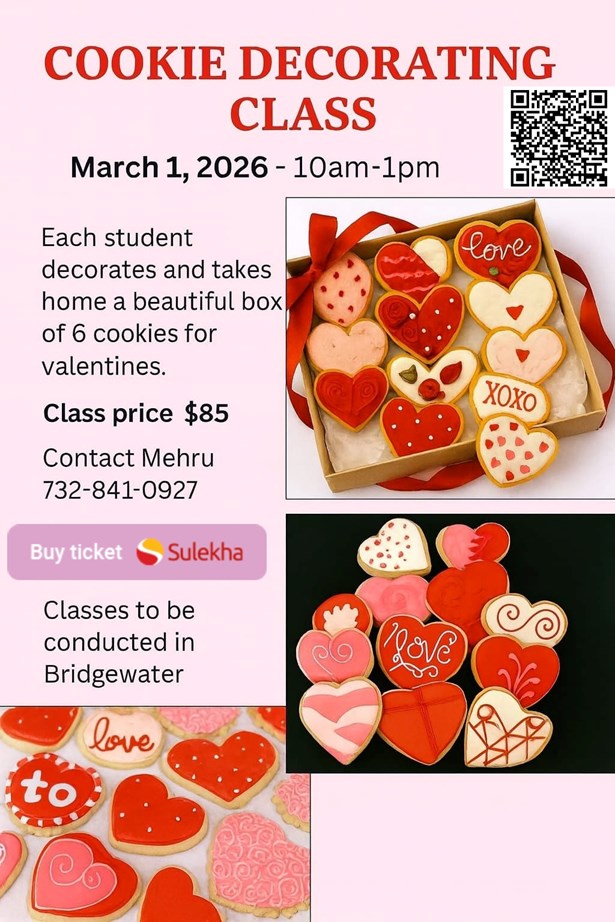 The Cookie Decorating Class for Valentine will be held in the peaceful and welcoming city of Bridgewater, NJ, United States. The venue is strategically located, ensuring safety and accessibility for all attendees. Parking will not be an issue as there are plenty of options available. And if you're a fan of Indian cuisine, you're in luck! Bridgewater is home to an array of Indian restaurants that will satisfy your cravings before or after the event.