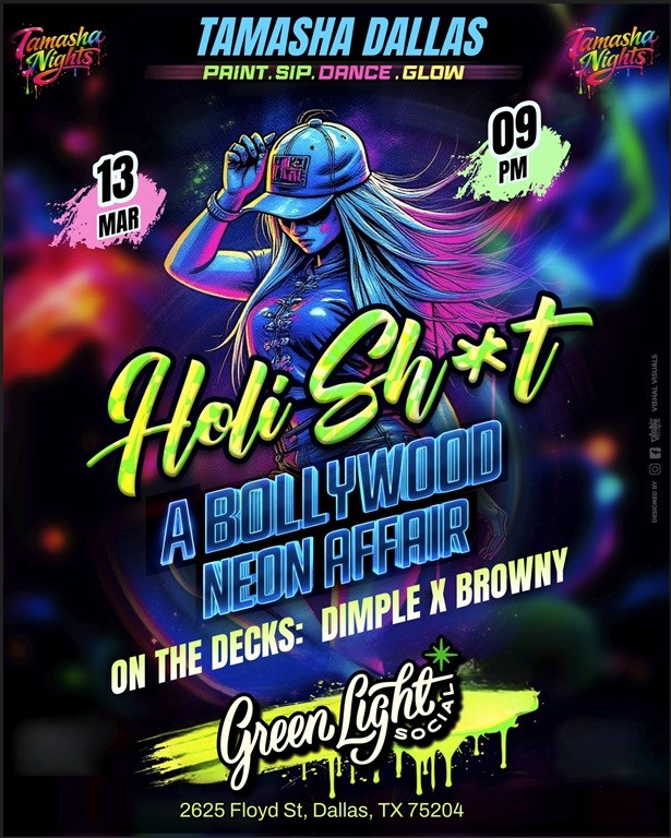 Welcome to the new era of Holi celebrations — elevated, electric, and unapologetically bold. At Green Light Social Dallas, step into a night where neon colors glow, beats take over, and the party never slows down.