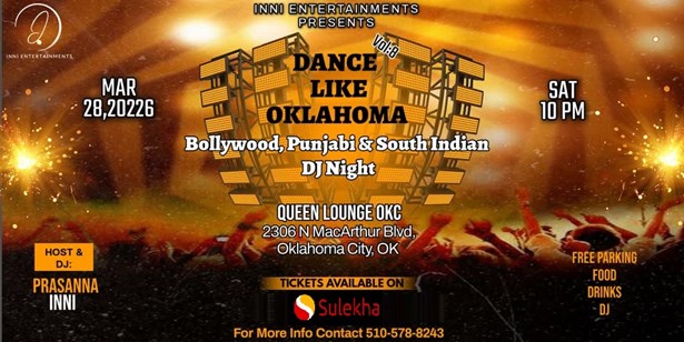 Get ready to immerse yourself in a unique dance experience at Dance Like Oklahoma Vol:8. This electrifying event is set to take place on 28th March, 2026 and promises to be an unforgettable night of rhythm, passion and movement. With a blend of Hindi, Telugu, Tamil and Bollywood dance styles, it's a multilingual dance event that will get your heart pumping and your feet moving. Don't miss this opportunity to be part of a cultural extravaganza that brings together the vibrant spirit of dance and the warmth of the Oklahoma community.