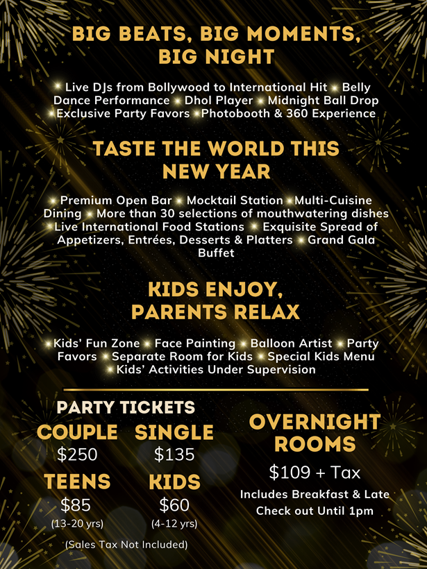 Don’t wait until the last minute! Book your tickets now to ensure your spot at the most happening New Year party. We offer a variety of ticket options to cater to everyone. For couples, the ticket price is $250.00, for singles it's $135.00. We haven’t forgotten the young ones - teens can join in the fun at $85.00 and kids at $60.00. Grab your tickets today and get ready to step into 2026 with a bang!