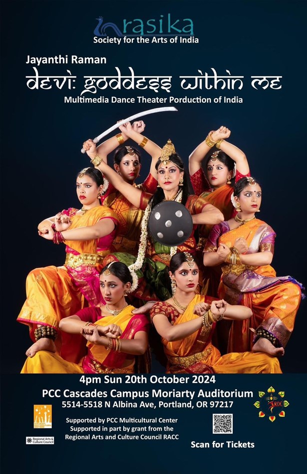 Jayanthi Raman Dance Company presents DEVI: Goddess Within Me: a multimedia music-dance theater performance from India. Devi - translates to Goddess in Sanskrit language. Featuring 10 dancers performing Bharatha Natyam from Portland and the athletic Chau classical dance from Delhi, India, the dance production takes us on a journey through India's vast and rich cultural heritage.