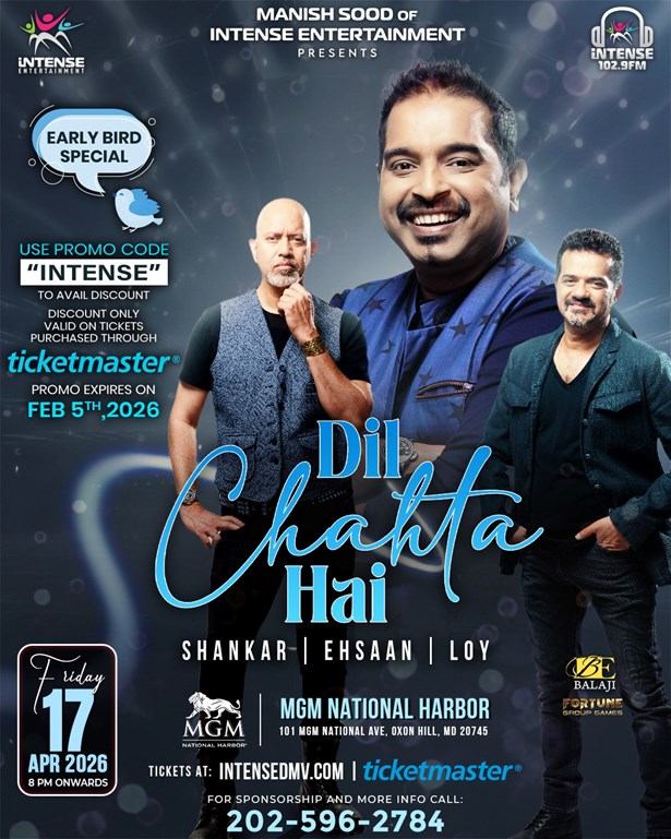 Get ready for an unforgettable evening of transcendent melodies and rhythmic beats as Intensedmv presents the Dil Chahta Hai concert featuring the renowned Shankar-Ehsaan-Loy on the 17th of April, 2026. This multilingual live concert promises to leave you captivated as it showcases the best of Indian music across Hindi, Tamil, Telugu, Marathi, and English. Don't miss out on this harmonious journey that will make your heart say "Dil Chahta Hai".