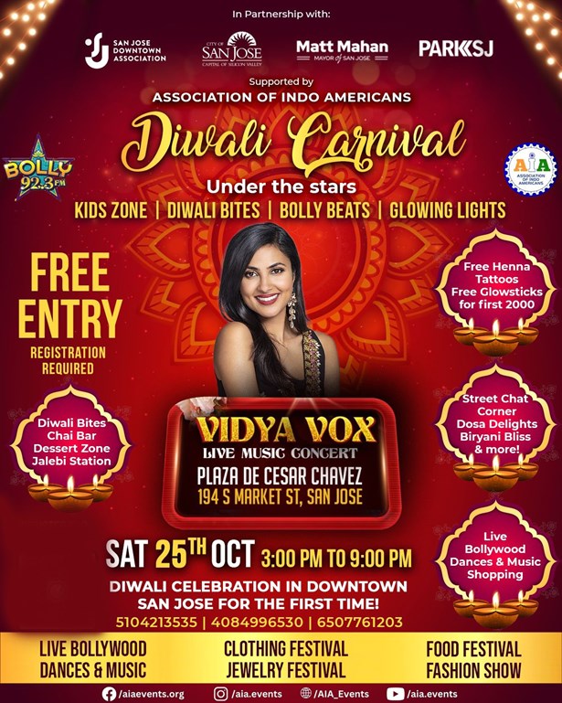 Event Details 🎆 Diwali Carnival Celebration with Vidya Vox Music Concert 🎶Get ready to light up your Diwali with an unforgettable celebration! Join us on Saturday, October 25 at 3:00 PM (PDT) at Plaza De Cesar Chavez, San Jose, CA for a day full of music, culture, and festive fun.Experience the electrifying performance of Vidya Vox, blending Indian classical music with global beats, while enjoying a vibrant Diwali Carnival featuring food stalls, games, dance, and cultural performances.Bring your friends and family for an afternoon of joy, lights, and rhythm — a true celebration of the Festival of Lights! ✨ 📍 Venue: Plaza De Cesar Chavez, 1 Paseo de San Antonio, San Jose, CA 95113Venue Details Plaza De Cesar Chavez1 Paseo de San Antonio , San Jose , CA 95113