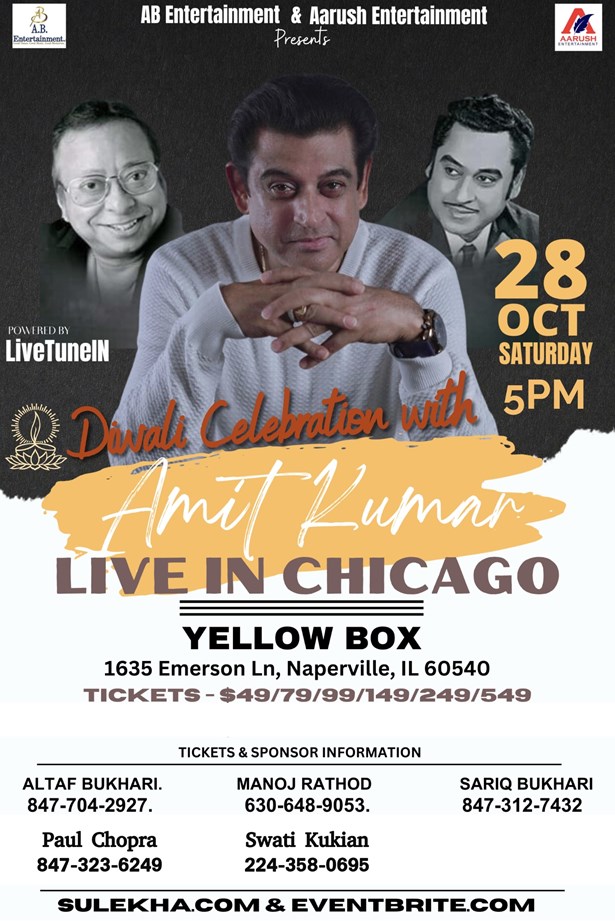 Get ready to illuminate your Diwali with the magic of music, as the one and only Amit Kumar takes the stage for a spectacular celebration! On Saturday, October 28th, the Yellow Box Theater in Naperville, IL, will be the epicenter of a Diwali celebration like no other. Join us for an evening of soulful melodies and unforgettable moments.