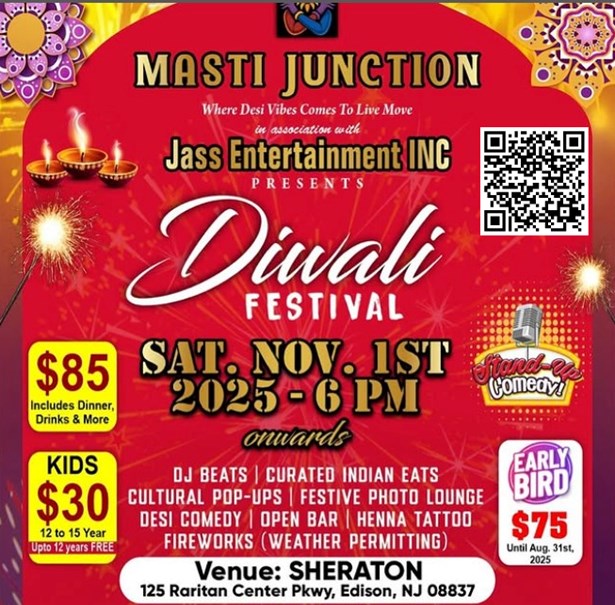 Buy ticketsEvent InfoVenueArtists Info Videos GalleryT & C FAQ Covid-19 Info Buzz Ticket Information Pay $0.00Register Adultincludes dinner, drinks & entertainmentincludes dinner, drinks & entertainment hide $85.00 Available 0 1 2 3 4 5 6 7 80 Ticket close on Oct 31 Teen Ages 12–15Kids under 12: FREEKids under 12: FREE hide $30.00 Available 0 1 2 3 4 5 6 7 80 Ticket close on Nov 1 Table of 8 $600.00 Available 0 1 2 3 4 5 6 7 80 Ticket close on Nov 10 Tickets / Total: Pay $0.000 Tickets Register Order Summary Tickets Order Summary Amount Payable $ Event Details Celebrate Diwali in Style! Join us for an unforgettable Diwali celebration filled with culture, entertainment, and festive vibes for the whole family!Event Highlights:Cocktail Hour & Open BarDesi Comedy ActsLive Singing PerformancesFireworks Show (weather permitting)Colorful Vendor BoothsNon-stop DJ MusicCurated Indian CuisineCultural Pop-upsFestive Photo LoungeFor Kids: Rangoli Competition (with prizes!) Henna Tattoos & Fun ActivitiesTickets: $85 per adult (includes dinner, drinks & entertainment) Ages 12–15: $30 | Kids under 12: FREE Table of 8: $600 (great for groups!) Don’t miss this vibrant night of lights, laughter, and celebration!Venue Details Sheraton125 Raritan Center Parkway , Edison , NJ 08837 X Report Error Is the information provided incorrect? Report it now! Event has been cancelled Event has been postponed This is an Adult event Event is fake/Inappropriate/Duplicate This event is a spam Please remove this event This event is private About this eventIlluminate Your Diwali at Sheraton Get ready to experience a unique blend of tradition, fun, and laughter at the grand Diwali Festival 2025. Organized by Masti Junction, this vibrant celebration will be held on Saturday, the 1st of November, 2025. Expect an unforgettable night of comedy, live in concert performances, delectable food and drinks, and a lively night party. Dive into the spirit of Diwali, the festival of lights, and create some unforgettable memories. Introducing the Mystery Artist This Diwali, prepare to be enthralled by a surprise artist, handpicked by Masti Junction. The mystery artist, a well-renowned name in the industry, is sure to captivate the audience with their exceptional talent and magnetic stage presence. Their performance will add to the festive ambiance, making this Diwali a truly memorable one. Experience Diwali at the Luxurious Sheraton The Diwali Festival 2025 will be hosted at the prestigious Sheraton, located at 125 Raritan Center Parkway, Edison, NJ, United States. Known for its safety, accessibility, and state-of-the-art facilities, Sheraton offers an ideal venue for a grand celebration like ours. The venue is surrounded by a variety of attractions and Indian restaurants, ensuring that attendees can enjoy a perfect blend of culture and cuisine. Ample parking space is available for all attendees. Grab Your Tickets Now! Excited already? Secure your spot for this grand celebration by purchasing your tickets now. We have various ticket options available - Adults can join the fun for just $85.00, while teens aged 12-15 can get in for $30.00. For those who want to enjoy the night with their friends or family, we offer a table of 8 for $600.00. Don't miss this opportunity to celebrate Diwali like never before! Terms & Conditions1. Tickets once purchased cannot be modified or cancelled. Refunds will be initiated only in case of event cancellation. 2. Transaction fee per ticket may be levied. Please check the total amount before payment. 3. Organizers hold the right to deny late entry to the event. Hence, we recommend reaching the venue an hour before the event starts to ensure smooth entry. 4. If an event is canceled/postponed, Sulekha will refund only the face value of the ticket and NOT the transaction fee. 5. Every venue has its own rules and regulations. They hold the right to deny entry on the basis of the same. 6. These terms and conditions are subject to change from time to time at the discretion of the organiser. 7. Important Alert: Tickets purchased from third parties are not authorized by Sulekha and will be denied entry. Buy only from Sulekha to ensure valid access. 8. As per current New Jersey Area mandatory health requirements, all attendees must present proof of a COVID-19 vaccination in order to enter the venue and attend the show. 9. Mask wearing is mandatory for all. 10. The venue reserves the right to alter safety protocols at any time and at its sole discretion of the management. 11. The event organizers value the safety of our audiences, artists, and staff. FAQ's How do I purchase tickets? There are several options when buying tickets: You can purchase any ticket to any events listed on our website. To buy, select the # of tickets you want to purchase in the dropdown of a specific event and follow the instructions. Email. Not sure where to go or how to buy tickets? Email us at us.sulekha@sulekha.com. Phone. You can purchase tickets over the phone 1-512-788-5300 (Mon to Fri - 11am to 8pm – EST) What is Sulekha's Refund Policy? All sales are final. No Refunds will be issued under any circumstance unless an event is canceled or rescheduled. If you event is canceled, in most cases you won't need to do anything. We will inform you about the cancelation and face value of the ticket will be refunded to your account, NOT the transaction fee. Refund will be processed by the same payment method used for purchase. By purchasing tickets you are accepting these terms. If you have any questions, please email us at us.sulekha@sulekha.com or call 1-512-788-5300 (Mon to Fri - 11am to 8pm – EST) Covid-19 Info Protecting Yourself Please follow the preventative measures recommended by the WHO and local authorities and public health agencies like the CDC. Please contact the event organizers to learn what they are doing to keep event attendees safe and healthy. What you should know before you go? Before you purchase your ticket or head t