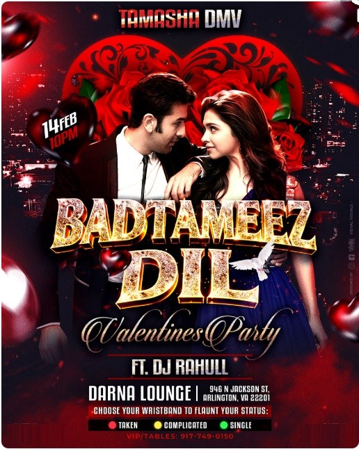 This Valentine’s Day, step into a red-hot, romantic Desi nightclub experience where Bollywood vibes, high-energy beats, and playful chemistry take over the night. Whether you’re celebrating love, navigating something complicated, or fully single and ready to mingle — BADTAMEEZ DIL is the place to be.