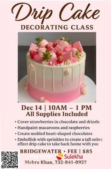 The Drip Cake Decorating class will be held at the TBA Bridgewater, New Jersey, USA. The venue is well-known for its safe and accessible location in the heart of Bridgewater. With ample parking available, you won't have to worry about finding a spot. And if you're in the mood for some authentic Indian cuisine post-class, there are several excellent Indian restaurants in the vicinity that are worth checking out.