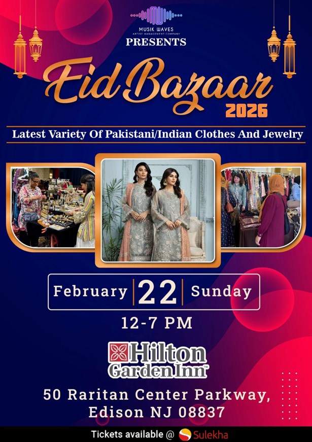 Join us for an extraordinary cultural extravaganza, the Eid Bazaar in Edison, on the 22nd of February, 2026. This event, organized by Azim NJ Musik Waves, will bring together diverse communities to celebrate the spirit of unity and brotherhood. Immerse yourself in a vibrant atmosphere filled with the melodious harmonies of Hindi, Bengali, Gujarati, Punjabi, and Urdu music, and explore an exhibition showcasing the richness of our shared cultural heritage.