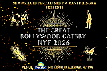 THE GREAT BOLLYWOOD GATSBY – NYE 2026 DEC 31, 7:30PM (EST) Days Hotel by Wyndham Allentown Airport / Lehigh Valley, 3400 Airport Rd, Allentown, PA Showsha Entertainment $30 - $80 Buy Tickets