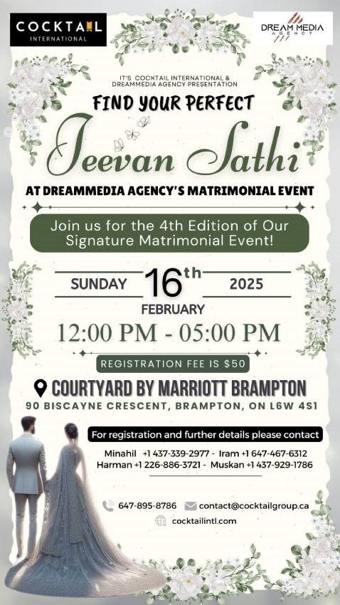 After the phenomenal success of our previous editions, the Matrimonial Event is back, and this time, it’s bigger than ever! Join us on 16th February 2025 at the elegant Courtyard by Marriott Brampton, where families, tradition, and modern connections come together in a one-of-a-kind experience designed to help you find the perfect match.