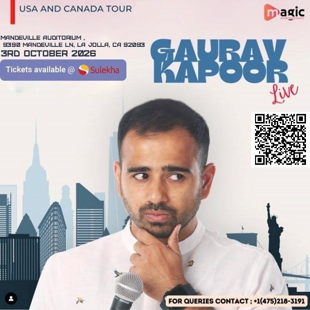 Mark your calendars for the 3rd of October, 2026! An evening packed with wit, humor, and laughter awaits you. The celebrated Indian comedian, Gaurav Kapoor, is all set to take the stage in San Diego. Known for his razor-sharp wit and charming persona, Gaurav Kapoor has been a consistent crowd-pleaser in the world of comedy. His ability to weave everyday situations into hilarious narratives is unmatched. The keywords for this event are Hindi, Comedy, and Music - a perfect blend for a memorable experience.