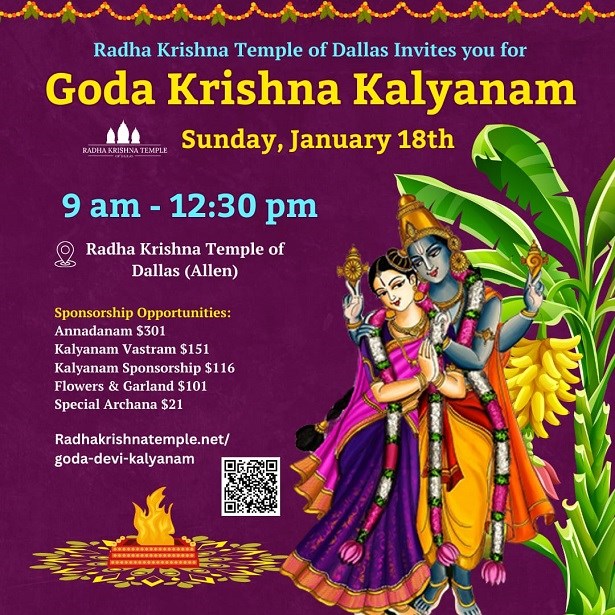 Radha Krishna Temple of Dallas warmly invites you and your family to participate in the sacred Goda Krishna Kalyanam, a traditional Vaishnava wedding ceremony celebrating the divine union of Goda Devi (Andal) and Lord Krishna.