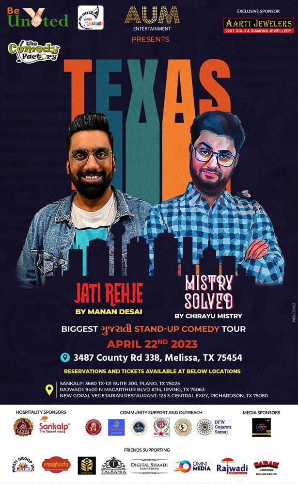 "THE COMEDY FACTORY!!!" The first kind of show from Gujarat and exclusively sponsored by AARTI JEWELERS and supported by Gujarati Samaj of Dallas.
