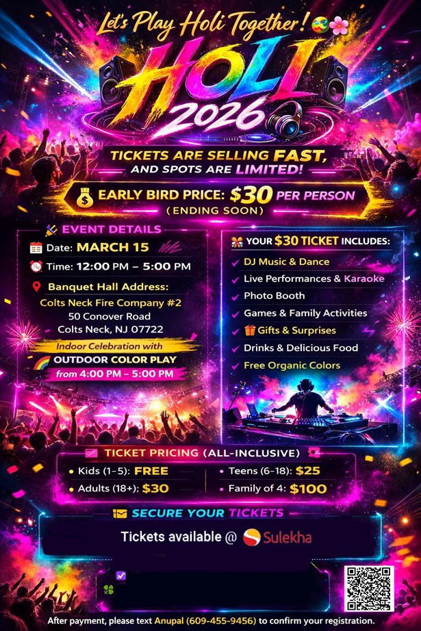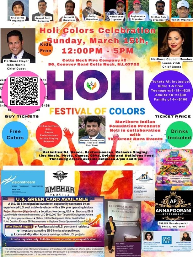 Get ready for a vibrant afternoon of colors, music, culture, and community fun! Marlboro Indian Foundation, in collaboration with The Great Aura Events, warmly invites you and your family to our Holi Colors Celebration 2026.