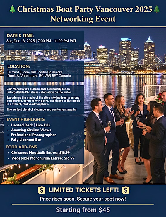 Celebrate the holidays in style aboard Vancouver’s most exciting Christmas Boat Party 2025 — a festive dinner and Live DJs cruise with stunning skyline views, live music, drinks, and nonstop holiday cheer!