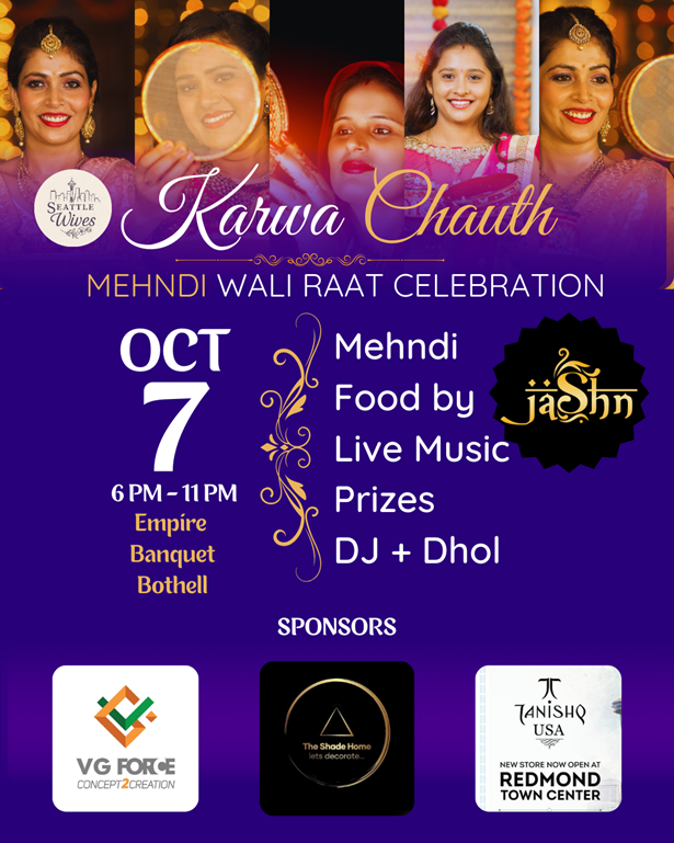 Buy ticketsEvent InfoVenueArtists Info Videos GalleryT & C FAQ Covid-19 Info Buzz Ticket Information Pay $0.00Register General TicketsInclude Food, Dance, DJ, Dhol, Live Sing ... show moreInclude Food, Dance, DJ, Dhol, Live Singing, Mehndi Artist, Shopping and Prizes hide $45.00 Available 0 1 2 3 4 5 6 7 8 9 100 Ticket close on Oct 70 Tickets / Total: Pay $0.000 Tickets Register Order Summary Tickets Order Summary Amount Payable $ Event Details Karwa Chauth Couple Night 2025: Glam Night Before the Fast Presented by Seattle Wives* Date & Time: Tuesday, October 7, 2025 | 6:00 PM – 11:00 PM* Venue: Empire Banquet Hall, Bothell, WA (Free Venue Parking)Seattle’s first-ever Couple Karwa Chauth Night is here! Celebrate love, tradition, and glam in true Bollywood style before the fast begins. This is the perfect pre-festival celebration for couples and families.Event Highlights: Mehndi Night – Get festive henna done by professional artists Best Dressed Karwa Chauth Queen Contest DJ & Dhol by DJ Ruseya Fufad Live Singing by Sonia Cultural Dance Performances Shopping & Vendor Stalls – Fashion, jewelry & festive essentials Fun Games, Raffles & Surprises Couple Photoshoots Dinner & Drinks – Delicious vegetarian feast VIP Experience Includes: Premium reserved seating, priority mehndi access, welcome gift bag, raffle bonus, professional photo op, Karwa Queen fast pass, special mention, and welcome drink.Why October 7? Karwa Chauth falls on October 9. October 7 is the perfect night to get your mehndi, enjoy music, dance, shop, and dine – so you can relax and fast stress-free on the festival day.Bring your spouse, dress to impress, and make it a romantic Desi Date Night to remember! Follow us on Instagram: @seattle_wivesFor Vendor & Sponsorship Inquiries: seattlewives@gmail.comContact: 206-303-0608Venue Details Empire Banquet & Conference Hall21222 30th Dr SE , Bothell , WA 98021 X Report Error Is the information provided incorrect? Report it now! Event has been cancelled Event has been postponed This is an Adult event Event is fake/Inappropriate/Duplicate This event is a spam Please remove this event This event is private About this eventExperience a Night of Tradition at Karwa Chauth - Mehndi Wali Raat Celebration Join us on the 7th of October, 2025 for a spectacular evening of tradition and celebration at the Karwa Chauth - Mehndi Wali Raat Celebration. Organized by Seattle Wives, this event is a beautiful blend of Hindi and English cultures, celebrating the auspicious festival of Karwa Chauth. This event promises a unique experience full of colors, music, and joy as we celebrate the bond of love and marriage in the spirit of Diwali. Introducing the Artists - Vibrant and Talented Henna Artists Although no specific artist is headlining our Karwa Chauth celebration, we have a talented team of henna artists who will be creating stunning designs. These artists excel in both traditional and contemporary mehndi designs, bringing their skills and creativity to help make this night unforgettable. Come and get your hands adorned with beautiful mehndi designs, symbolizing the strength and beauty of love and marital bliss. About the Venue - Empire Banquet & Conference Hall The Karwa Chauth - Mehndi Wali Raat Celebration will be held at the Empire Banquet & Conference Hall, located at 21222 30th Dr SE, Bothell, WA, United States. This exquisite venue is known for its safety, accessibility, and proximity to a number of attractions. Ample parking is available for guests. After the celebration, you can enjoy a sumptuous meal at one of the many nearby Indian restaurants, providing the perfect end to a night of celebration. Grab Your Tickets Now! Be sure to secure your spot at this much-anticipated event. Stay tuned for ticketing details and prepare to immerse yourself in a night of tradition, celebration, and unity at the Karwa Chauth - Mehndi Wali Raat Celebration. Terms & Conditions1. Tickets once purchased cannot be modified or cancelled. Refunds will be initiated only in case of event cancellation. 2. Transaction fee per ticket may be levied. Please check the total amount before payment. 3. Organizers hold the right to deny late entry to the event. Hence, we recommend reaching the venue an hour before the event starts to ensure smooth entry. 4. If an event is canceled/postponed, Sulekha will refund only the face value of the ticket and NOT the transaction fee. 5. Every venue has its own rules and regulations. They hold the right to deny entry on the basis of the same. 6. These terms and conditions are subject to change from time to time at the discretion of the organiser. 7. Important Alert: Tickets purchased from third parties are not authorized by Sulekha and will be denied entry. Buy only from Sulekha to ensure valid access. 8. As per current Seattle Metro Area mandatory health requirements, all attendees must present proof of a COVID-19 vaccination in order to enter the venue and attend the show. 9. Mask wearing is mandatory for all. 10. The venue reserves the right to alter safety protocols at any time and at its sole discretion of the management. 11. The event organizers value the safety of our audiences, artists, and staff. FAQ's How do I purchase tickets? There are several options when buying tickets: You can purchase any ticket to any events listed on our website. To buy, select the # of tickets you want to purchase in the dropdown of a specific event and follow the instructions. Email. Not sure where to go or how to buy tickets? Email us at us.sulekha@sulekha.com. Phone. You can purchase tickets over the phone 1-512-788-5300 (Mon to Fri - 11am to 8pm – EST) What is Sulekha's Refund Policy? All sales are final. No Refunds will be issued under any circumstance unless an event is canceled or rescheduled. If you event is canceled, in most cases you won't need to do anything. We will inform you about the cancelation and face value of the ticket will be refunded to your account, NOT the transac