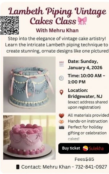 Prepare for a delightful day of creativity and culinary flair at the "Lambeth Piping Vintage Cakes Class with Mehru Khan in NJ". Scheduled for the 4th of January, 2026, this event promises a unique experience blending Hindi culture, multilingual communication, and the art of food and drink. Under the guidance of Mehru Khan, participants will learn how to create stunning vintage cakes, making this event a must-attend for anyone with a passion for baking, creativity, and cultural immersion.
