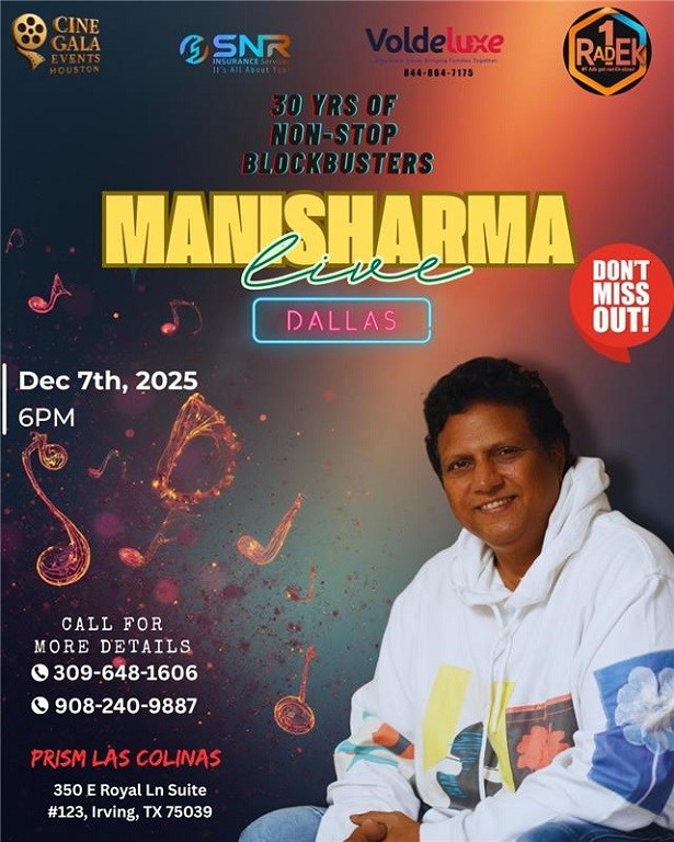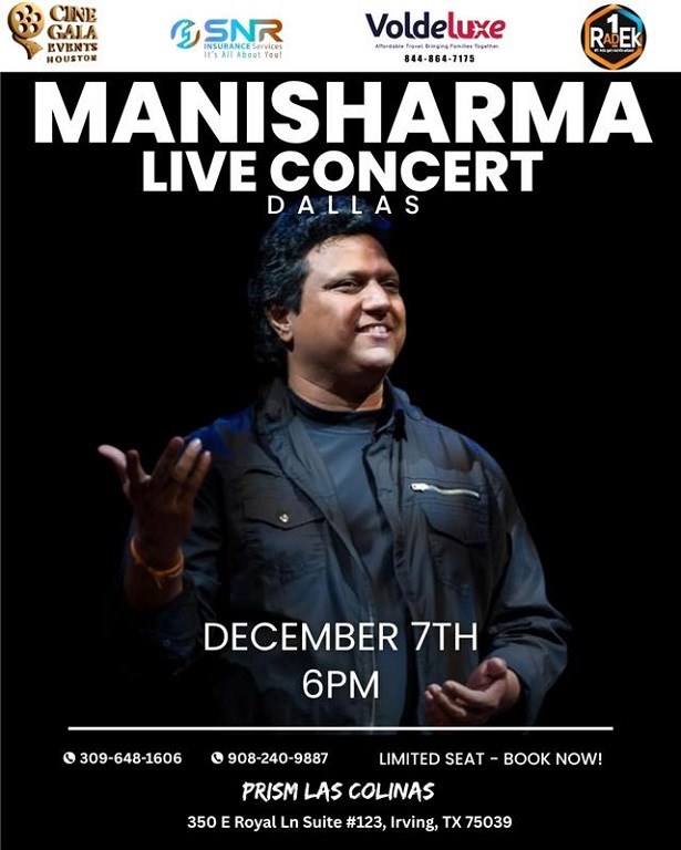 Get ready to be enthralled by the musical genius of Mani Sharma at the 'Mani Sharma Live in Concert in Dallas' event. Set to take place on the 7th of December, 2025, this evening promises to be an unforgettable experience of melody and rhythm. This live concert, brought to you by Cine Gala Events, LLC, is a must-attend for all music lovers, particularly fans of Telugu and Tamil film music. Don't miss the chance to see the 'Melody Brahma' in action.
