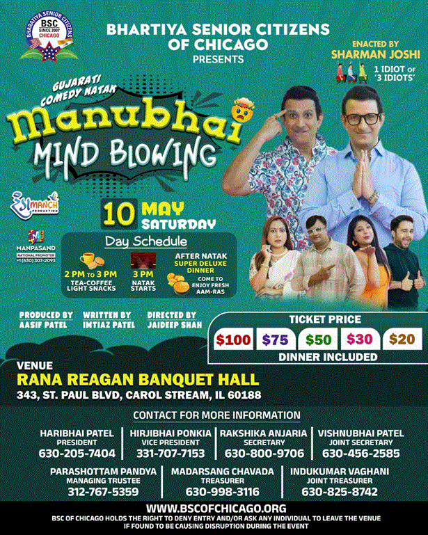Get ready, Chicago! The most talked-about Gujarati comedy drama, “Manubhai Mindblowing,” is coming to town for an afternoon of unstoppable laughter and unforgettable entertainment!