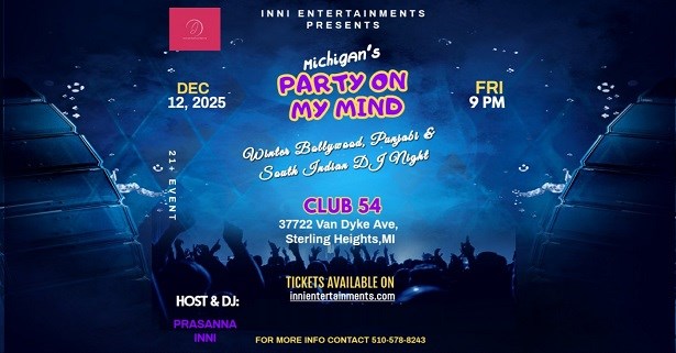 Mark your calendars for an unforgettable night! "Michigan's Party On My Mind" is set to sway your senses on the 12th of December, 2025. This electrifying event promises a mesmerizing amalgamation of Hindi, Telugu, Tamil, Malayalam and fusion music genres, making it a perfect multilingual night party. Embrace the spirit of Bollywood as you dance and groove to the rhythm of the music. This is not just a party, it's a celebration of diversity, music, and life itself.
