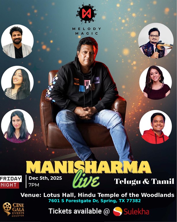 Buy ticketsEvent InfoVenueArtists Info Videos GalleryT & C FAQ Covid-19 Info Buzz Ticket Information I Want To Select My Seats VIPFirst 4 Rows for VIP Fans and GuestsFirst 4 Rows for VIP Fans and Guests hide $100.00 Available Ticket close on Dec 5 EnergeticFor Energetic Fans!For Energetic Fans! hide $75.00 Available Ticket close on Dec 5 GeneralGeneral TicketsGeneral Tickets hide $50.00 Available Ticket close on Dec 5 I Want To Select My Seats Event Details 🌟 A Grand Musical Tribute to the Legendary Mani Sharma 🌟Celebrating 30 Years of Musical BrillianceJoin us for an unforgettable evening as we honor the iconic Mani Sharma — the “Melody Brahma” of South Indian cinema — in a spectacular live musical celebration!For over three decades, Mani Sharma has enchanted millions with his timeless compositions, soul-stirring melodies, and powerful background scores that have defined generations of music lovers. His music continues to inspire artists and captivate audiences across the world.Now, for the first time ever in The Woodlands, Texas, experience the magic of his legendary tunes performed live on stage by an incredible lineup of artists.✨ Be part of this historic celebration — a night filled with nostalgia, rhythm, and emotion, honoring the genius who redefined South Indian film music. 🎶 Celebrate the legacy. Feel the music. Live the magic. 🎶Venue Details Lotus Hall7601 South Forestgate Drive , Spring , TX 77382 X Report Error Is the information provided incorrect? Report it now! Event has been cancelled Event has been postponed This is an Adult event Event is fake/Inappropriate/Duplicate This event is a spam Please remove this event This event is private About this eventExperience the Melodies of Mani Sharma Live in Concert Mark your calendars for an unforgettable evening as Melody Magic proudly presents the MS30 - Mani Sharma Live Concert. This mesmerizing event is scheduled for the 5th of December, 2025. Immerse yourself in the musical cosmos of Telugu and Tamil melodies, as the legendary music director Mani Sharma graces the stage. This live in concert is a must-attend for every music lover and promises to be a rich blend of stirring tunes and soulful singing. Meet the Maestro - Mani Sharma Mani Sharma Yanamandra, fondly known as the "Melody Brahma" (God of Melody), is the star of the evening. Celebrated for his remarkable work in Telugu and Tamil films, Mani Sharma has left an indelible mark in the music industry. With a repertoire that includes music scores for over 175 films in South Indian languages, his contributions to Tollywood are unparalleled. His love for music is reflected in his admiration for legendary singers like S. P. Balasubrahmanyam, K. S. Chithra, and Shankar Mahadevan. This concert is a rare opportunity to witness his musical prowess live in action. Lotus Hall - The Perfect Backdrop for a Musical Evening Lotus Hall, nestled at 7601 South Forestgate Drive, Spring, TX, United States, is the chosen venue for this spectacular event. Well-known for its safety and easy accessibility, it adds to the overall appeal of the concert. The venue is surrounded by a plethora of attractions, making it a perfect choice for a complete evening outing. There's ample parking available and for those who fancy a pre-concert dinner, a host of Indian restaurants are just around the corner. Seize Your Tickets Now Grab your tickets today to ensure your place at this musical extravaganza. We have different ticket categories to suit your preferences. Choose from VIP tickets priced at $100.00 for an exclusive experience, Energetic tickets at $75.00 for those who love to groove, or opt for the General tickets at $50.00 for a comfortable and enjoyable evening. Terms & Conditions1. Tickets once purchased cannot be modified or cancelled. Refunds will be initiated only in case of event cancellation. 2. Transaction fee per ticket may be levied. Please check the total amount before payment. 3. Organizers hold the right to deny late entry to the event. Hence, we recommend reaching the venue an hour before the event starts to ensure smooth entry. 4. If an event is canceled/postponed, Sulekha will refund only the face value of the ticket and NOT the transaction fee. 5. Every venue has its own rules and regulations. They hold the right to deny entry on the basis of the same. 6. These terms and conditions are subject to change from time to time at the discretion of the organiser. 7. Important Alert: Tickets purchased from third parties are not authorized by Sulekha and will be denied entry. Buy only from Sulekha to ensure valid access. 8. As per current Houston Metro Area mandatory health requirements, all attendees must present proof of a COVID-19 vaccination in order to enter the venue and attend the show. 9. Mask wearing is mandatory for all. 10. The venue reserves the right to alter safety protocols at any time and at its sole discretion of the management. 11. The event organizers value the safety of our audiences, artists, and staff. FAQ's Where is the Mani Sharma Concert happening? Lotus Hall, 7601 South Forestgate Drive, Spring, TX When do Mani Sharma event tickets go on sale in Spring, TX? Mani Sharma upcoming concert tour tickets go on sale 1 to 2 months prior to the performance and sometimes even a year in advance. Once the tour dates and concert schedule are announced, you can check our event calendar to find the date and venue. Mani Sharma concert tickets will generally be available within 24-48 hours of a tour announcement. How do I purchase tickets? There are several options when buying tickets: You can purchase any ticket to any events listed on our website. To buy, select the # of tickets you want to purchase in the dropdown of a specific event and follow the instructions. Email. Not sure where to go or how to buy tickets? Email us at us.sulekha@sulekha.com. Phone. You can purchase tickets over the phone 1-512-788-5300 (Mon to Fri - 11am to 8pm – EST) What is Sulekha'