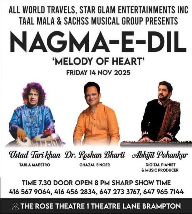 Buy ticketsEvent InfoVenueArtists Info Videos GalleryT & C FAQ Covid-19 Info Buzz Ticket Information Pay CA$0.00Register Level 1 - Balcony CA$45.00 Available 0 1 2 3 4 5 6 7 8 9 10 11 12 13 14 15 16 17 18 19 200 Ticket close on Nov 14 Level 2 - Lower Level CA$60.00 Available 0 1 2 3 4 5 6 7 8 9 10 11 12 13 14 15 16 17 18 19 200 Ticket close on Nov 14 Level 3 - VIP CA$75.00 Available 0 1 2 3 4 5 6 7 8 9 10 11 12 13 14 15 16 17 18 19 200 Ticket close on Nov 14 Level 4 - VVIP (Meet and Greet) CA$100.00 Available 0 1 2 3 4 5 6 7 8 9 10 11 12 13 14 15 16 17 18 19 200 Ticket close on Nov 140 Tickets / Total: Pay CA$0.000 Tickets Register Order Summary Tickets Order Summary Amount Payable CA$ Event Details Prepare for a Night of Enchanting Melodies That Will Touch Your Soul!Join us for NAGMA-E-DIL: “Melody Of Heart” – a mesmerizing fusion of classical rhythms, heartfelt ghazals, and innovative keyboard artistry!Date & Time: Friday, November 14, 2025 8 pm …Rose Theatre, 1 Theatre Lane, BramptonTicket Prices: $45, $60, VIP, and VVIPContact for tickets:Bhavesh Kothari: 416 567 9064Presented by Westend Travel Inc., Star Glam Entertainments Inc., Taal Mala & Sachss Musical Group.Don’t miss this rare musical convergence – secure your seats today and let the melodies transport you!#NagmaEDil #MelodyOfHeart #UstadTariKhan #DrRoshanBharti #AbhijitPohankar #IndianClassicalMusic #GhazalNight #TablaVirtuoso #BramptonEvents #LiveConceUstad Tari Khan: The virtuoso Tabla Maestro from Lahore’s Punjab gharana, born in 1953. He’s the first tabla player to receive the prestigious Taj Poshi (Golden Crown), along with the Hazrat Amir Khusro Award and Pakistan Television Music Award. With a lineage tracing back to Bhai Mardana, his performances at global venues like Delhi’s Habitat Centre and Japan’s Asian Music Conference have captivated audiences worldwide.Abhijit Pohankar: Born in 1975 to classical vocalist Pandit Ajay Pohankar, he’s India’s only classical keyboardist and a fusion music maestro. Renowned for his groundbreaking album PIYA BAWARI, a milestone in Indian instrumental music, he blends traditional ragas with contemporary sounds as a composer, producer, and singer – the face of new-age Indian music!Dr. Roshan Bharti: A promising ghazal sensation from the Senia gharana, trained from age five by his father Ustad Yaseen Bharti and grandson of Ustad Jamal Khan. Holding a doctorate on the legendary Begum Akhtar from Rajasthan University, he’s a top-grade All India Radio artist, associate professor of Indian classical music for 25 years, and recent recipient of the JIMA Award for Best Ghazal Male Artist. His worldwide performances embody the essence of poetic emotion.Venue Details The Rose Theatre, Brampton1 Theatre Lane , Brampton , ON L6V 0A3 X Report Error Is the information provided incorrect? Report it now! Event has been cancelled Event has been postponed This is an Adult event Event is fake/Inappropriate/Duplicate This event is a spam Please remove this event This event is private About this eventImmerse in the Rhythm at NAGMA-D-DIL: "Melody of Heart" Mark your calendars for the 14th of November, 2025. Starglam entertainments brings you an enchanting evening of melodious music at NAGMA-D-DIL: "Melody of Heart". Immerse yourself in an unforgettable live concert featuring soulful renditions of Hindi and Gujarati classical music. The event promises to be a memorable experience for music lovers and a perfect way to embrace the cultural heritage of India. A Showcase of Unnamed Talent The stage will be set afire by our talented and passionate artist. Their harmonious fusion of Hindi and Gujarati classical tunes will leave you mesmerized. With their captivating performance, they have managed to win hearts across the globe, making them a crowd favorite. Don't miss this chance to witness their magical renditions live in concert. Experience the Charm of The Rose Theatre The Rose Theatre in Brampton, Canada, located at 1 Theatre Lane, is the chosen venue for this enchanting evening. This iconic theatre is well-known for its superior acoustics and comfortable seating, making it a preferred choice for such events. The theatre's location in Brampton, ON, ensures easy accessibility and offers ample parking space. It also lies in close proximity to some of the best Indian restaurants in town, allowing you to indulge in some authentic Indian cuisine before or after the concert. Secure Your Seats Now! Make sure you don't miss out on this musical extravaganza. Tickets are available at various pricing levels to suit your preference. Choose from Level 1 - Balcony priced at 45.00, Level 2 - Lower Level at 60.00, or treat yourself to a VIP experience with Level 3 - VIP tickets at 75.00. For a truly unforgettable experience, opt for the Level 4 - VVIP (Meet and Greet) tickets, priced at 100.00. Book your tickets now and immerse yourself in the "Melody of Heart". Terms & Conditions1. Tickets once purchased cannot be modified or cancelled. Refunds will be initiated only in case of event cancellation. 2. Transaction fee per ticket may be levied. Please check the total amount before payment. 3. Organizers hold the right to deny late entry to the event. Hence, we recommend reaching the venue an hour before the event starts to ensure smooth entry. 4. If an event is canceled/postponed, Sulekha will refund only the face value of the ticket and NOT the transaction fee. 5. Every venue has its own rules and regulations. They hold the right to deny entry on the basis of the same. 6. These terms and conditions are subject to change from time to time at the discretion of the organiser. 7. Important Alert: Tickets purchased from third parties are not authorized by Sulekha and will be denied entry. Buy only from Sulekha to ensure valid access. 8. As per current Toronto Metro Area mandatory health requirements, all attendees must present proof of a COVID-19 vaccination in order to enter the venue and attend the sho