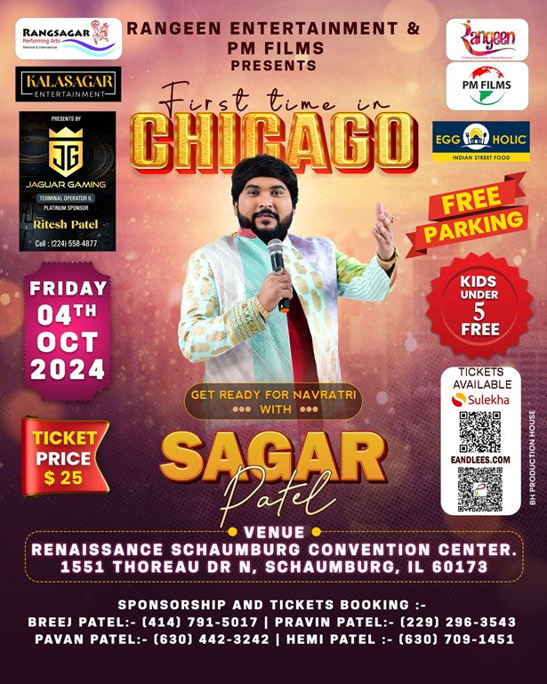 Gear up for an electrifying start to the Navratri season with our Navratri Garba Tour across the USA, featuring the sensational Sagar Patel this October 4, 2024 in Chicago for the very first time!