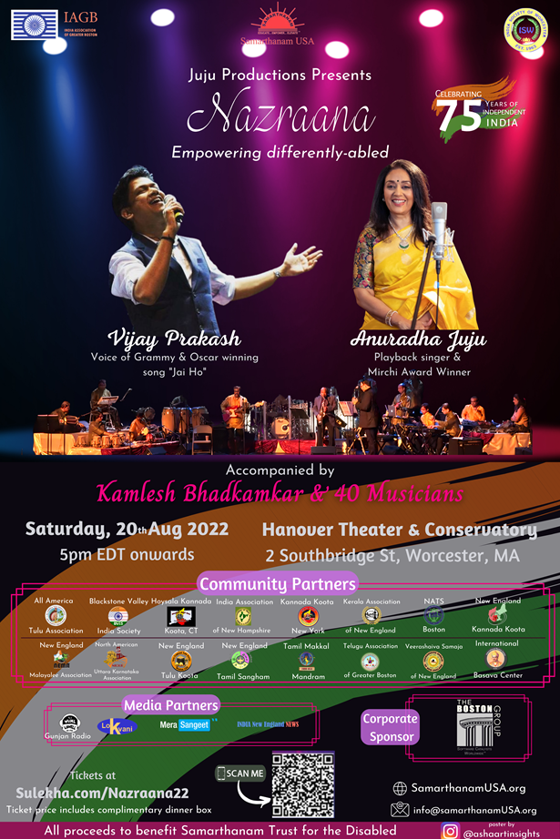 Vijay Prakash said, “It’s an honor to be associated with such wonderful minds and hearts. Samarthanam is doing transformational work by skilling, empowering and changing the lives of differently-abled people. I am also thrilled to be sharing the stage with Anuradha ji for a live concert for the first time – our earlier concert was online. Performing with the grand band of musicians from Mumbai led by Mr Kamlesh Bhadkamkar is the icing on the top. Boston music lovers – be prepared for a spectacular treat. I am looking forward to a great musical evening”.
