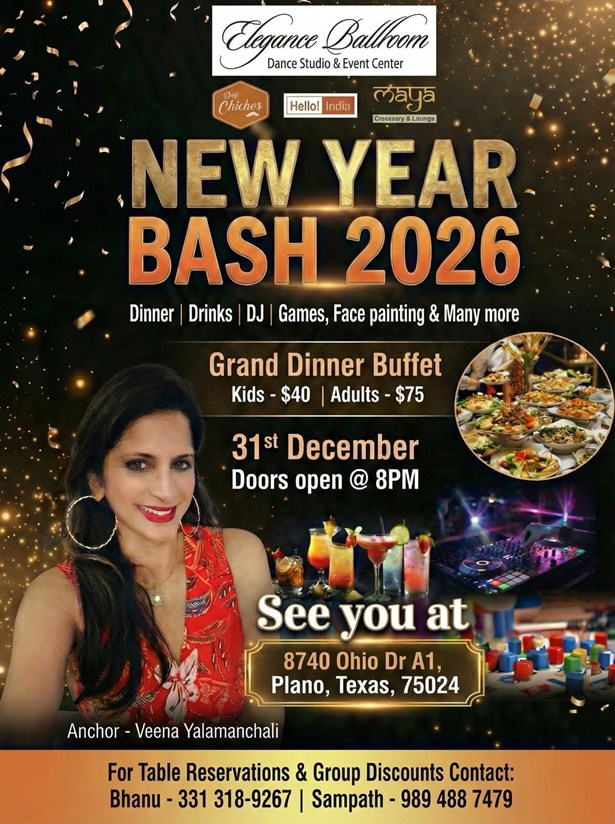 Join us for an unforgettable end to the year at the New Year Bash 2026. This grand celebration will take place on the 31st of December, 2025, promising a night filled with music, dance, and an array of food and drinks. As the clock strikes midnight, we will welcome the new year in a multilingual environment, with Telugu and English being the predominant languages. This night party is the perfect blend of joy, entertainment and cultural richness, making it the ultimate New Year Event in Plano.