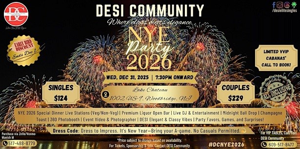 Hosted at the beautiful Lake Chateau Banquets, located at 1002 U.S. 9, Woodbridge, NJ, United States, this event promises a stunning backdrop for your New Year's Eve celebrations. This venue is known for its safety, accessibility, and nearby attractions. Parking will not be a concern as ample space is available for the attendees. To add more to your experience, you can explore nearby Indian restaurants for a taste of authentic Indian cuisine after the event.