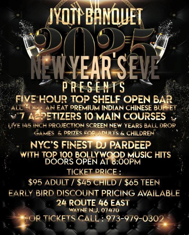 Join us for a spectacular New Year's Eve celebration at JYOTI BANQUET in WAYNE NJ