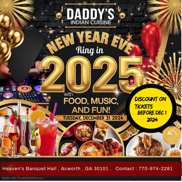 New Year’s party event starts at 6:30 PM on December 31st, 2024 and ends at 2 AM EST on January 1st. Buffet served including Pizza, Biryanis, appetizers and wings. Welcome drink included in the price, and Drinks are available on purchase.