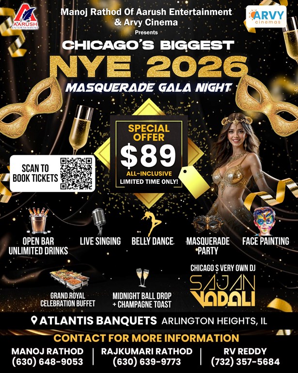 Join us on Wednesday, December 31 at 8:00 PM (CDT) at the stunning Atlantis Banquets, 1273 North Rand Road, Arlington Heights, IL 60004, for a spectacular New Year’s Eve Gala filled with dazzling lights, lively beats, and festive vibes.